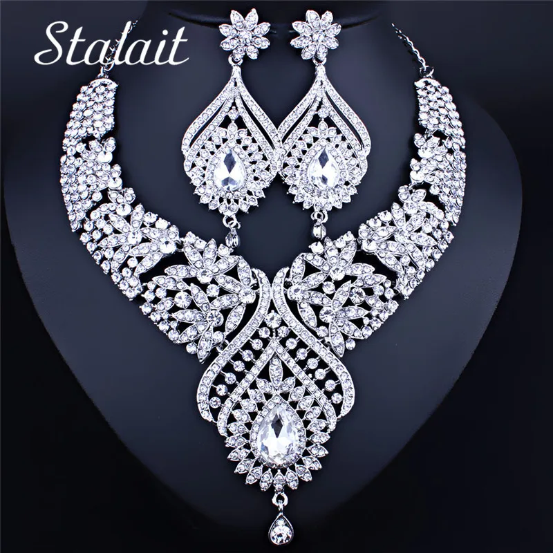 ORIGINAL Gothic Dubai Silver Rhinestone Flower Crystal Women Bridal Jewelry Necklace Earrings Fashion Weddin