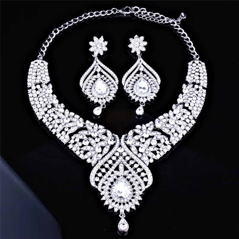 Gothic Dubai Silver Rhinestone Flower Crystal Women Bridal Jewelry Necklace Earrings Fashion Weddin