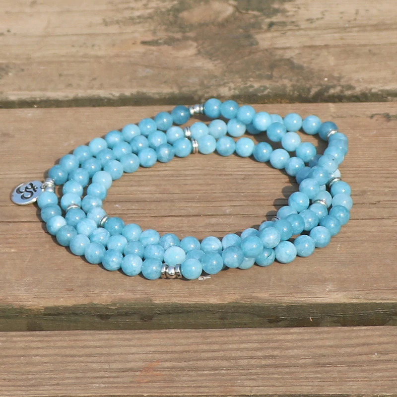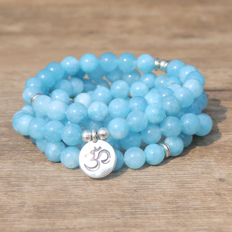 Trendy Reiki Lotus Ohm Charm Aqua-marine Wrap Bracelet Unisex Jewelry 108 Mala Beads 'Stone of the