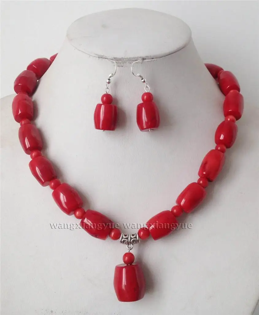 BEST Charming!Big Red Coral Column Shape Beads Necklace Earrings Set >> watch wholesale Quartz stone CZ