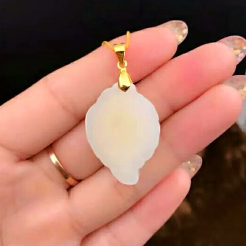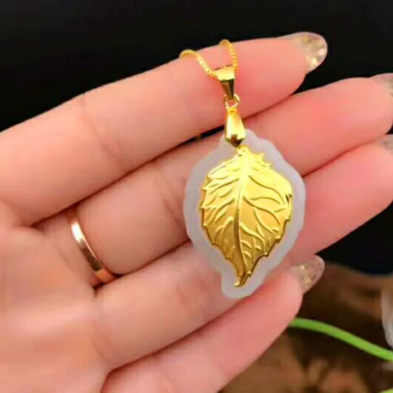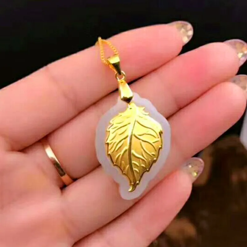 Review Top Natural White HeTian Yu + Full Gold Inlaid Carved Beauty Tree Leaf Style Lucky Pendant Necklace + C